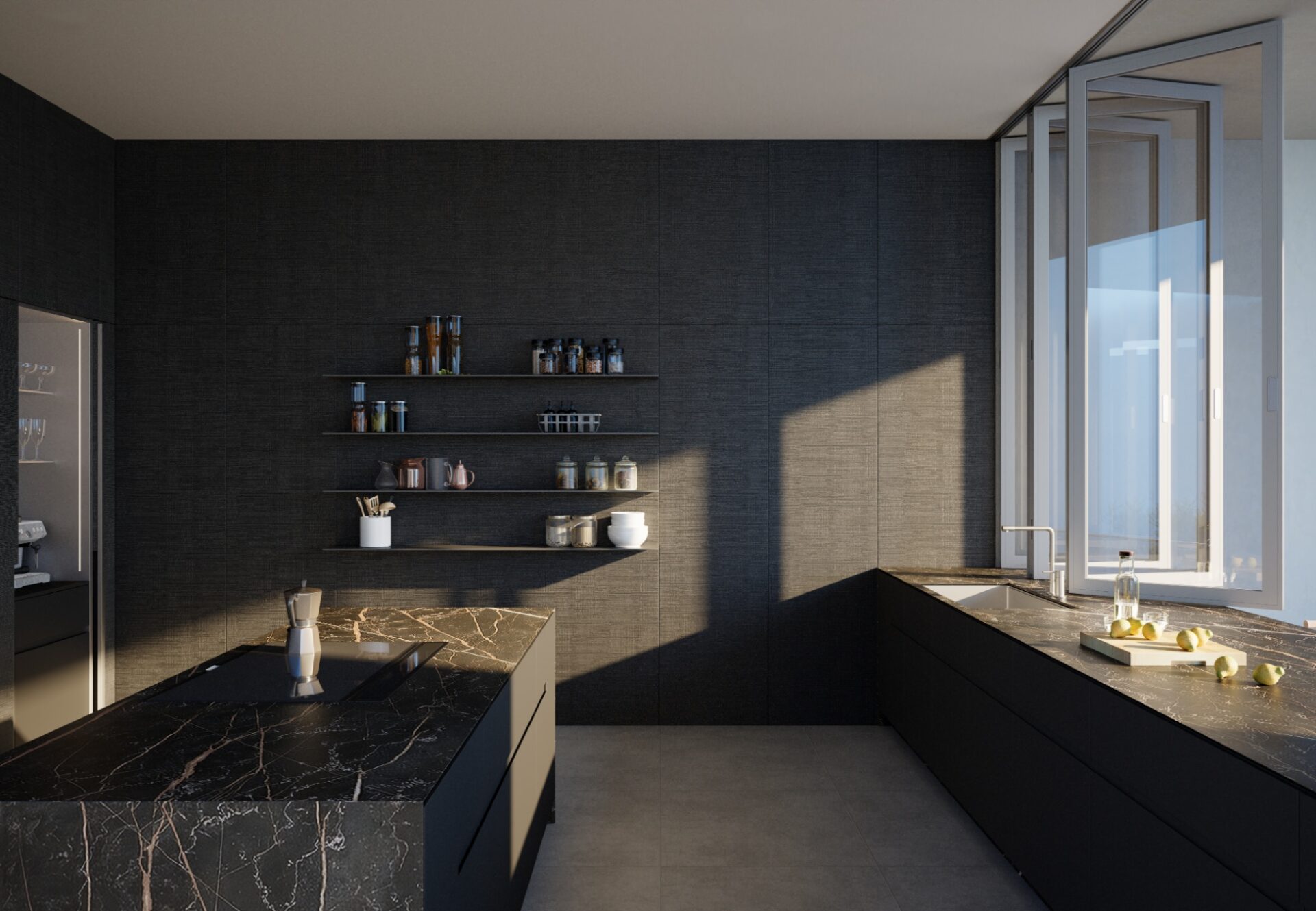 The kitchens at Asteras Kings showcase Italian craftsmanship from Treviso, a city celebrated for design, culinary tradition, and as the birthplace of tiramisu. Handcrafted dark oak cabinetry pairs with leathered marble countertops, blending warmth and natural texture to create a serene yet richly detailed environment of warm minimalism.